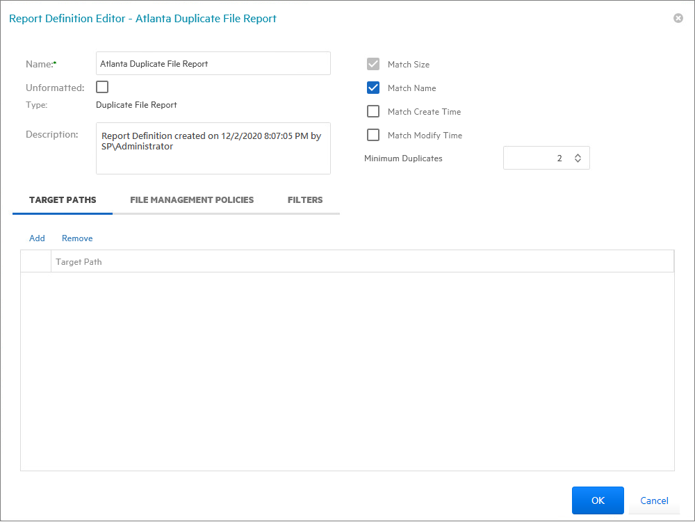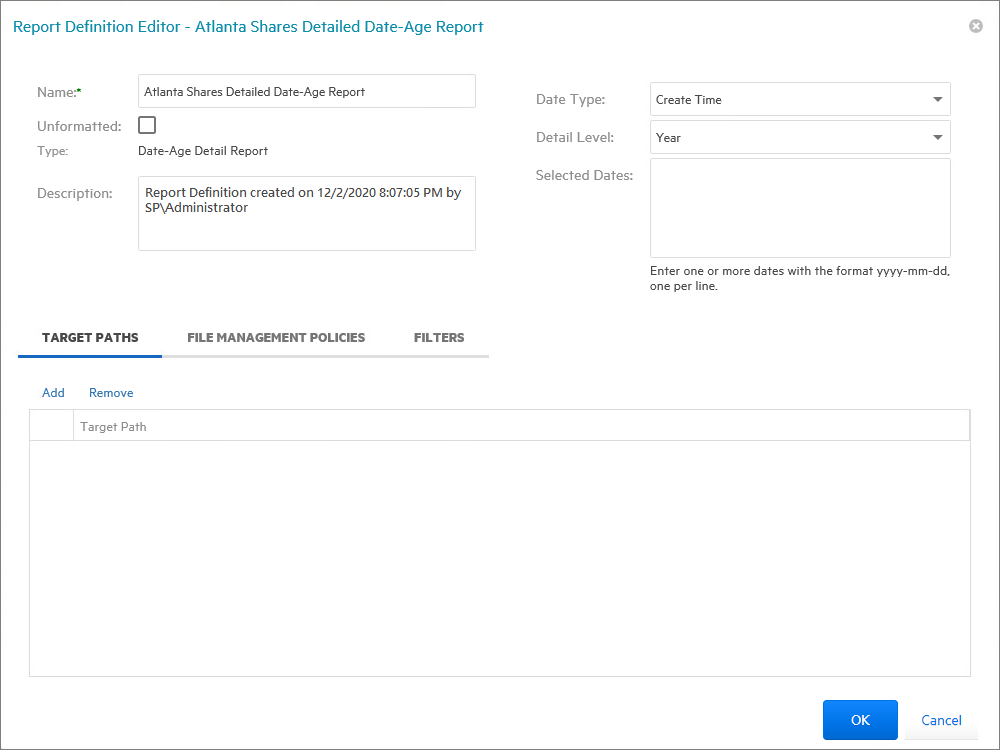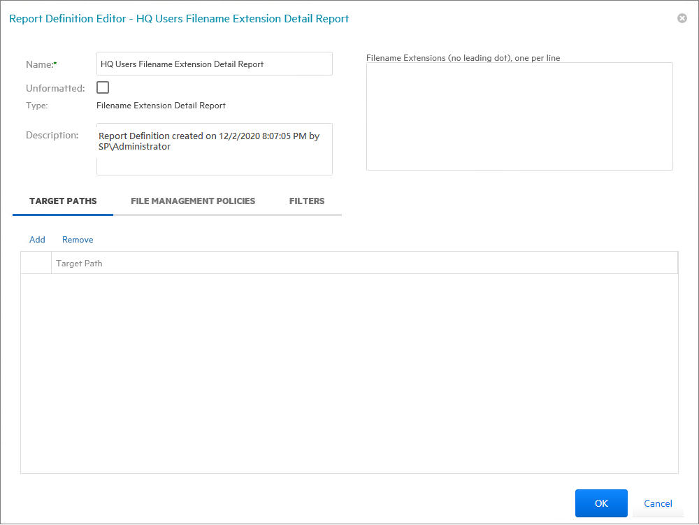 From the Target Paths tab, click Add, then browse to and specify the file paths you want included in the report and click OK.