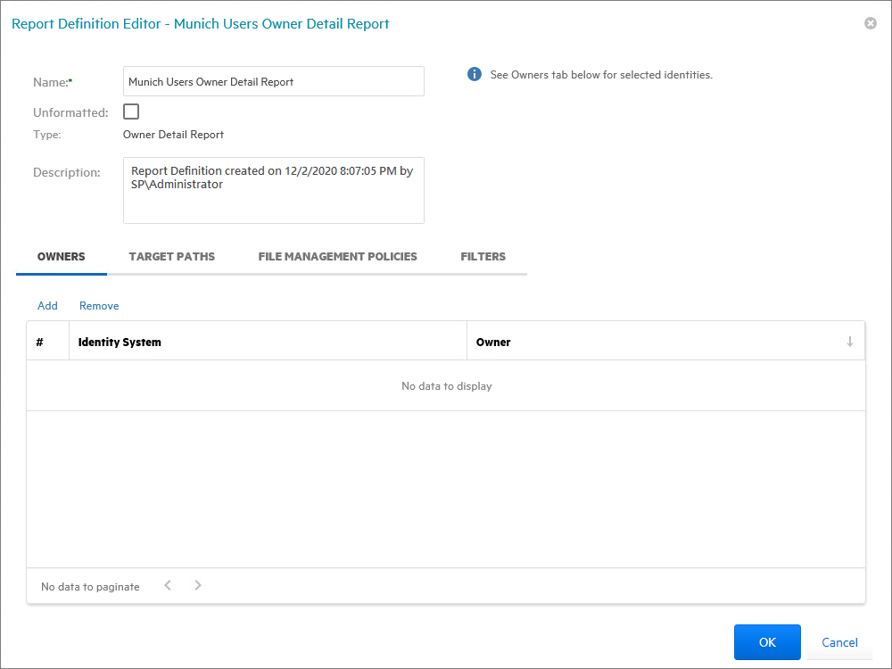 From the Owners tab, click Add, then browse to and specify the owners you want in the report and click OK.