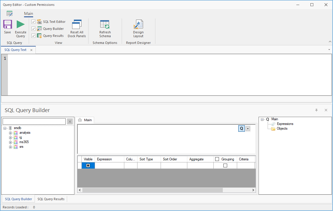 In the SQL Query Builder region, expand srs to see the Tables and Views folders.