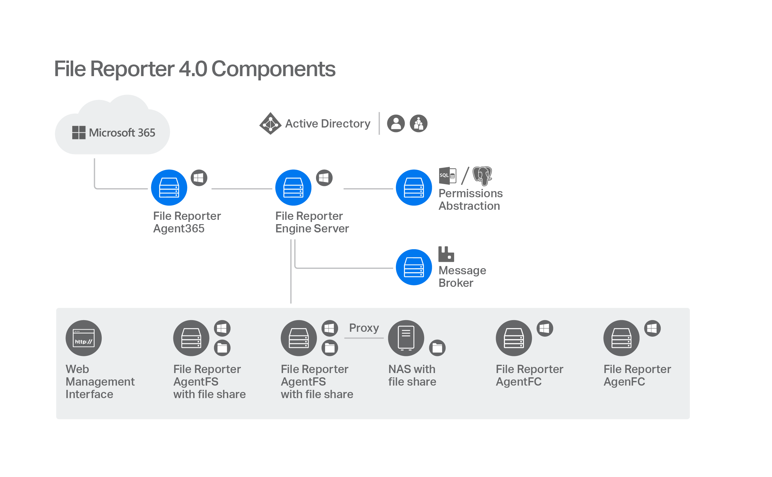 To examine, report, and analyze this data efficiently, File Reporter disperses the work among a Web application, Engine, Agents, a Scan Processor, the RabbitMQ messaging broker, either a PostgreSQL or Microsoft SQL Server database, Microsoft Active Directory, and Microsoft Azure Active Directory.