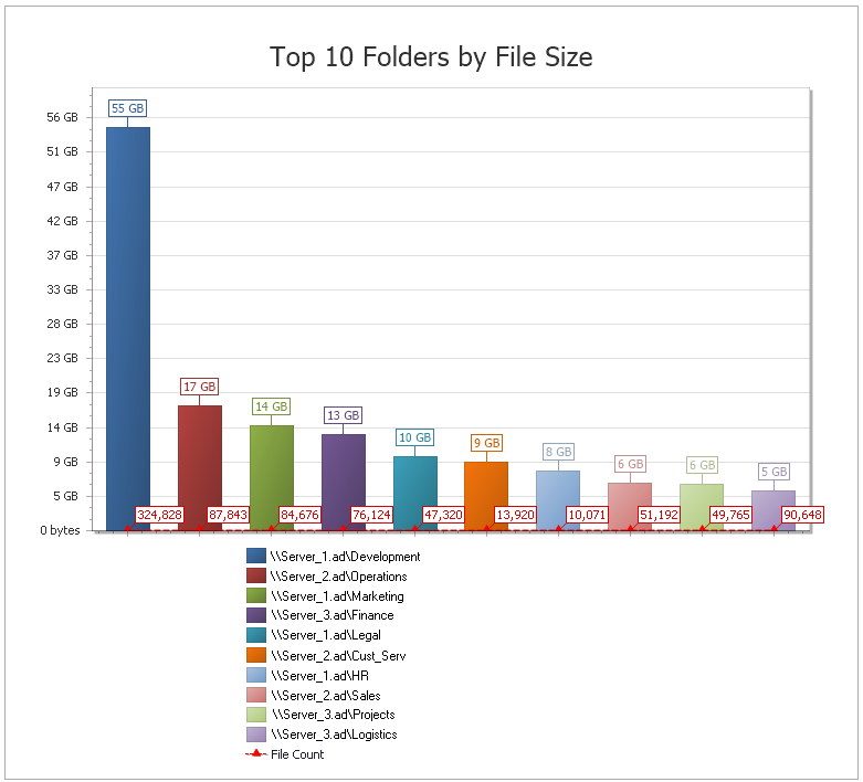File Reporter lets you present built-in reports in various formats including PDF, Microsoft Excel, RTF, HTML, TXT, and CSV. The product also includes built-in graphs for certain report types.