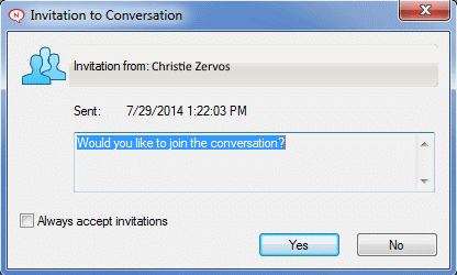 After a user accepts the invitation to join the conversation, he or she can send messages to the other participants. A user cannot see any messages that were sent before he or she joined the conversation, or after he or she leaves the conversation.