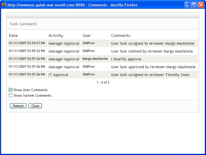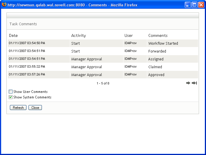 A pop-up window lets you see user and system comments. The order in which comments appear is determined by the time stamp associated with each comment. Comments entered first are displayed first. For parallel approval flows, the order of activities being processed concurrently can be unpredictable.