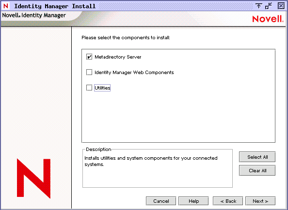 In the Welcome to the Novell Identity Manager Installation dialog box, click , then accept the license agreement.