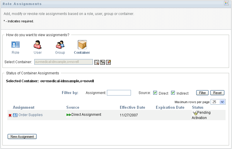 To view only those assignments that were assigned indirectly, select the box. Indirect assignments are those assignments that a container receives through a role relationship.