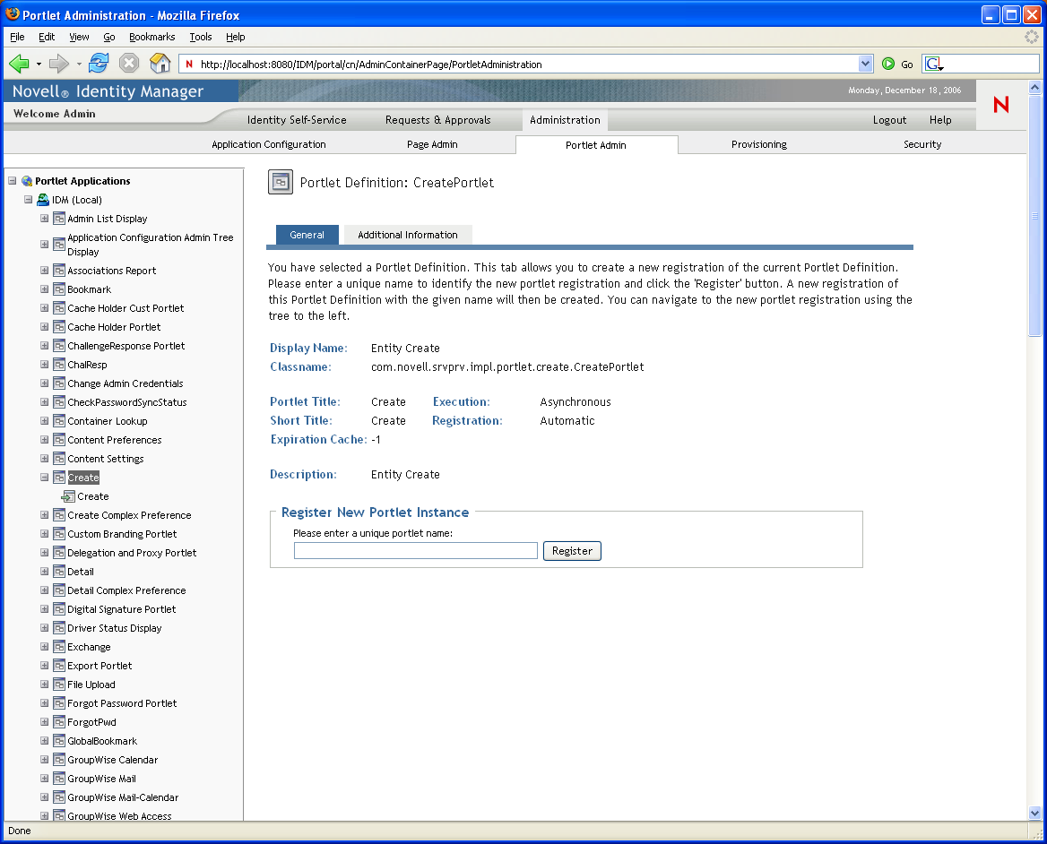 Before you can use a portlet, you must register that portlet definition with the portal (Identity Manager User Application). A registered portlet definition is called a portlet registration. You can create multiple registrations for a single portlet, which enables you to put multiple instances of that portlet on the same page.