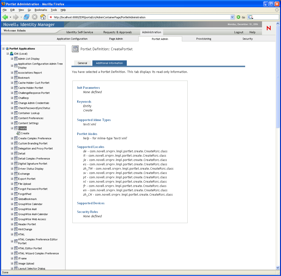 Go to the Additional Information panel to view further details about the selected portlet definition: