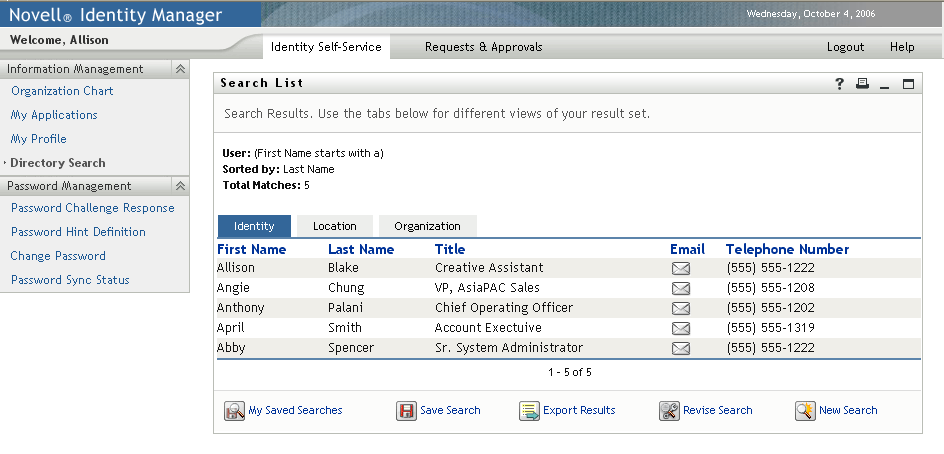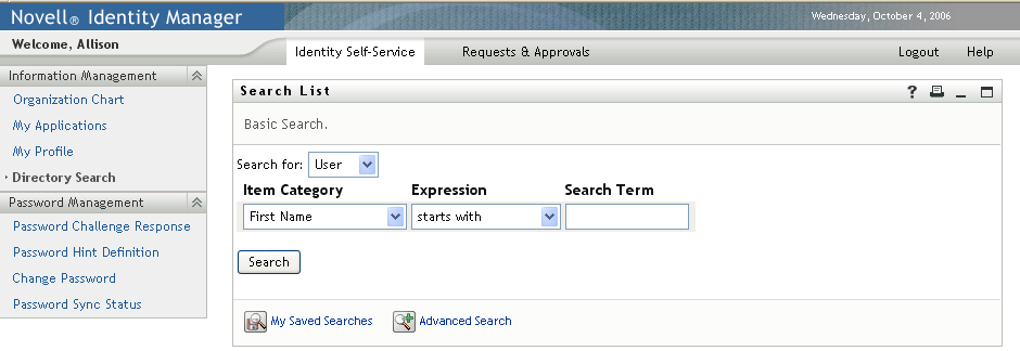 The Search List portlet allows users to search and display the contents of the Identity Vault. It is the basis for the Directory Search action of the Identity Manager User Application Identity Self-Service tab. The Directory Search action is configured to allow users to search for users and groups, but you can modify it to change the scope of searchable objects and attributes.