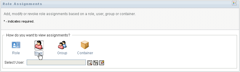 To view only those assignments that were assigned indirectly, select the box. Indirect assignments are those assignments that a user receives through a role relationship, or by being a member in a group or container.
