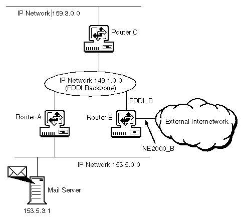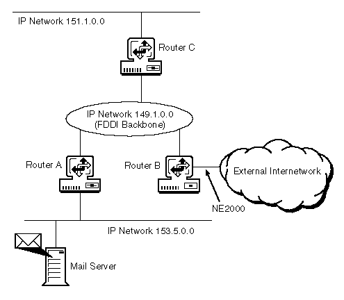 In this example, an organization has an FDDI backbone connecting several departments within the organization and a link to external networks. Routers A and C connect the departmental networks to the backbone. Router B connects the external networks to the backbone. Within the organization, users can communicate freely across the internetwork. External access is limited to electronic mail. The internetwork topology is shown in Figure 6 .