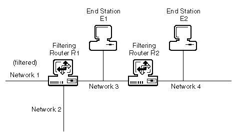 The route to Network 1 is filtered out in Router R1's advertisement to Network 3. If End Station E2 sends a packet to Network 1, Router R2 drops that packet because it does not have a route. If End Station E1 sends a packet to Network 1, Router R1 forwards it because it does have a route. End Station E1 can send a packet to Network 1 only if it has a route to that network. End station E2 can see only Networks 2, 3, and 4. End station E1 can see both Networks 1 and 2.
