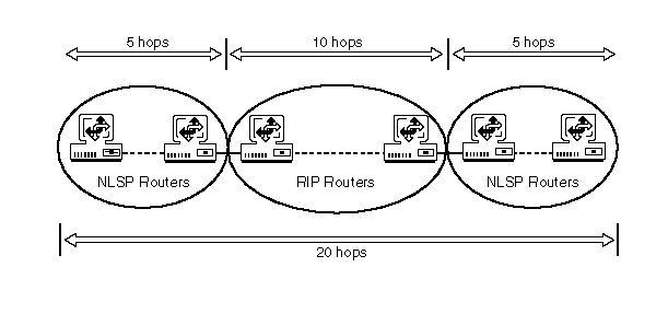If the diameter of your IPX network is close to the 16-hop limit, you should run NLSP on the routers at the network boundary to ensure continued connectivity across the network as it grows. Figure 14 provides a simple, conceptual view of how this can work.