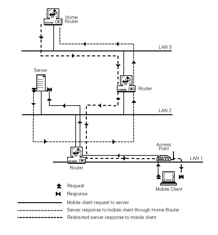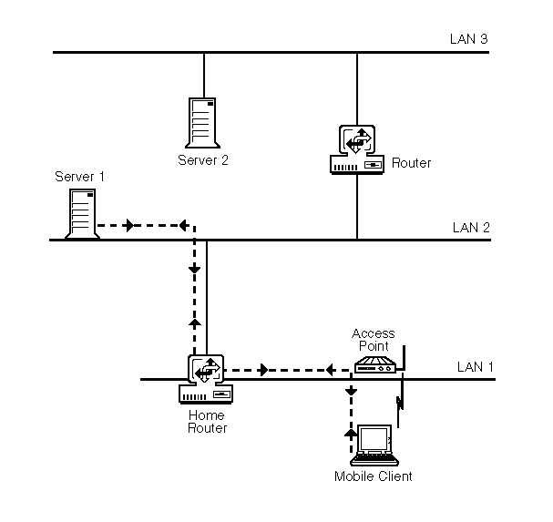 A Home Router forwards every packet destined for the mobile clients it serves. If the Home Router is located far from both the file server and the mobile client, and if the mobile client is close to the file server, a packet destined for the mobile client travels more hops than necessary before arriving at the destination, as shown in Figure 8 .