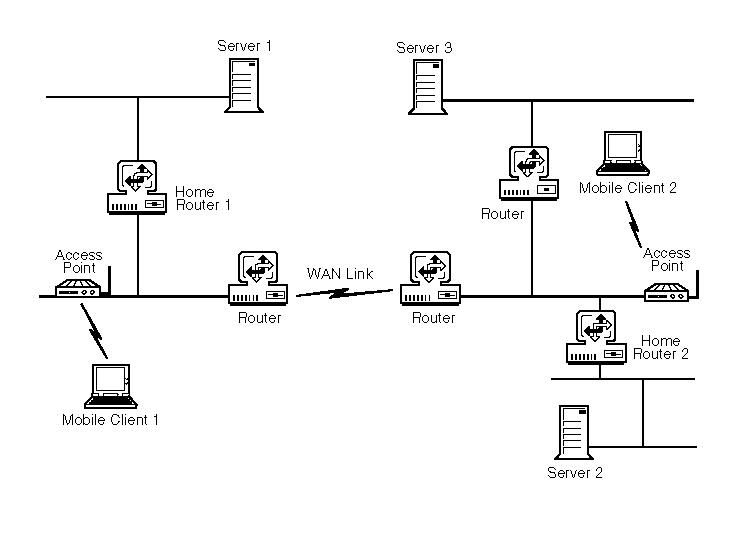 If the server and mobile clients are located on one side of a WAN link and the Home Router is on the other side of the link, costly WAN bandwidth is used unnecessarily. If both networks on each side of a WAN link require NetWare Mobile IPX, you should have two Home Routers---one on each side of the WAN link. Mobile clients use the closest Home Router, as shown in Figure 11 .