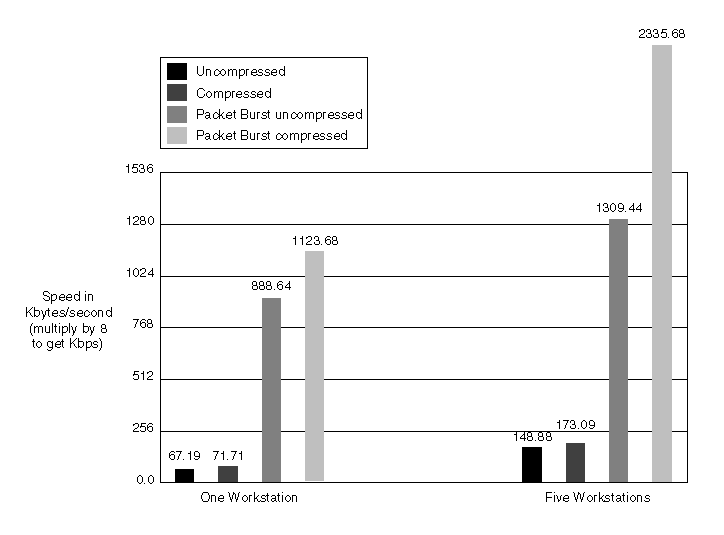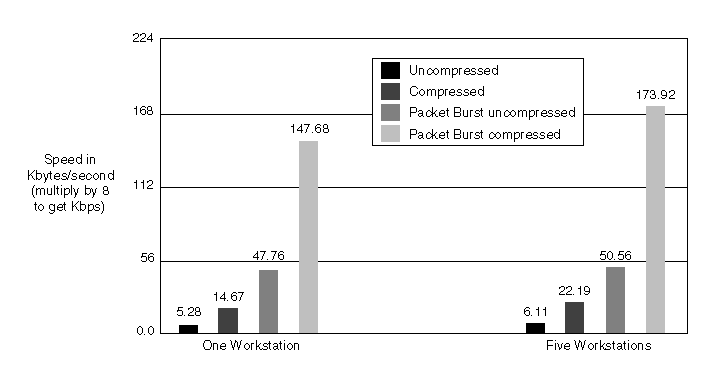 Data compression alone gives a gain of less than a 20 percent with five workstations. When given a Packet Burst stream, compression increases the result by more than 75 percent. Improvements in line efficiency with a single stream range from less than 7 percent to more than 25 percent.