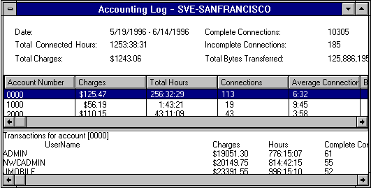 From this example, you can see that the Accounting Log window is divided into three sections. The top section contains billing period summaries; the middle section shows connections by account number; and the bottom section lists the users assigned to the selected account number along with data for each user.