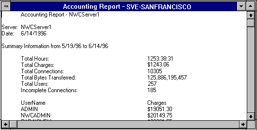 From this example, you can see an Accounting Report window with data for connections made between 5/19/96 and 6/14/96.