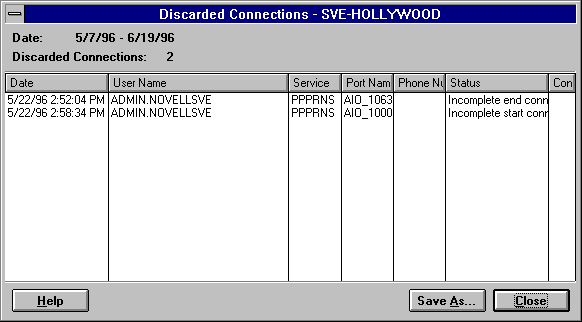 To display the incomplete connections and connection records with duplicate connection IDs, with the Accounting Log window open, choose Accounting > View Invalid Connections.