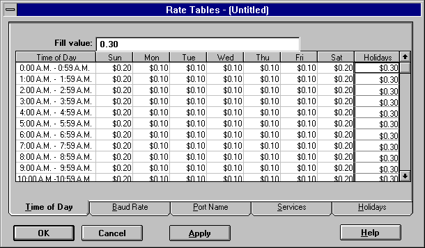 NOTE: To enter the same amount in multiple cells, highlight the desired cells and enter the desired rate in the Fill value edit box. Click the Apply button. This fills the highlighted cells with the entered rate. Rates must begin with an integer, for example 0.50 or 1.20. A leading decimal point will not be accepted.