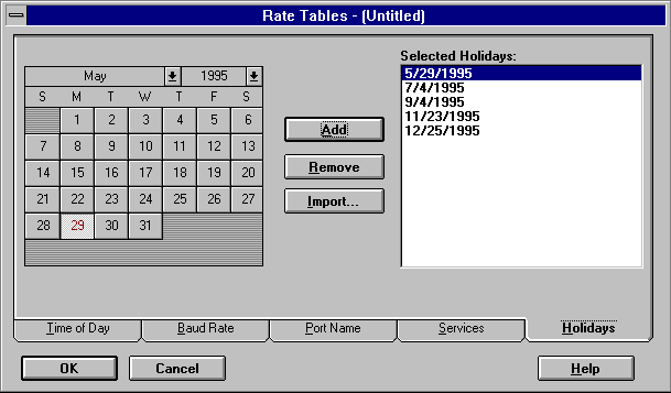 When specifying time of day rates, ConnectView enables you to specify holidays of the year to receive special rates. When a connection occurs on a day assigned to be a holiday, holiday rates are used in place of any other rates. Enter the desired holiday rates in the Holidays column in the Time of Day rate table.