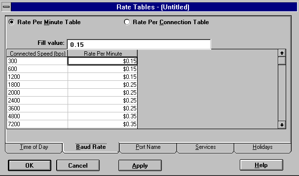ConnectView enables you to create a rate table based on cost per minute or cost per connection for baud rates used for a connection (connection speeds).
