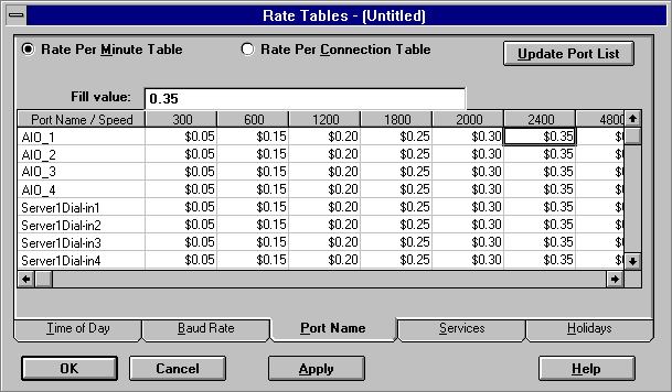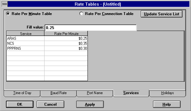 Click the Rate Per Minute Table or the Rate Per Connection Table radio button and enter the desired rates in the rate column. To update the list of available services on the current server, click the Update Service List button.