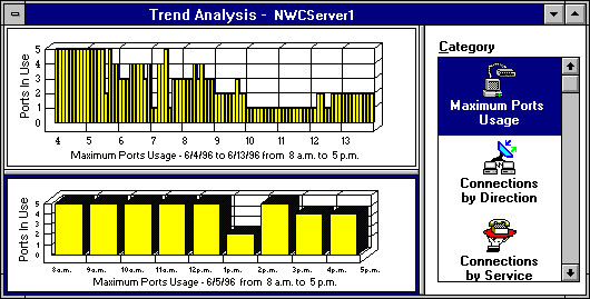 To display a split trend analysis window, position the cursor over the upper gray border of the window (just under the Title Bar) until it changes shape to parallel lines with two arrows. Press and hold the left mouse button. Drag the border to the desired position and release the mouse button. Click the icon for the desired category. Figure 18 shows an example split window with maximum port usage data.