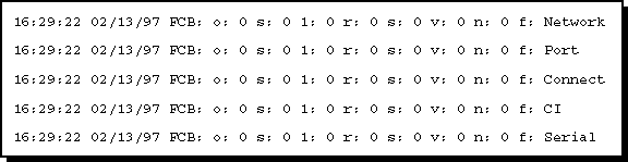 After it is loaded, the NCS Debug utility displays a window with information similar to that shown in Figure 51. (The information shown in Figure 51 displays the server in its initial start-up phase.) As data transfers occur, lines are displayed with a date, timestamp, and function control block (FCB) information.