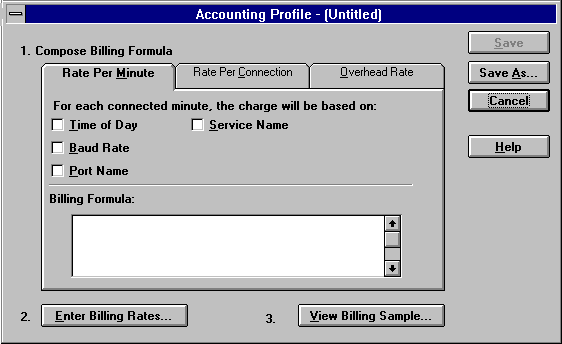 Accounting profiles define how charges will be calculated with a billing formula and rates. First, specify the desired billing formula (Step 1). Then enter the desired rates (Step 2). After the billing formula and rates have been entered, view sample charges to verify that the formula and rates are correct (Step 3).