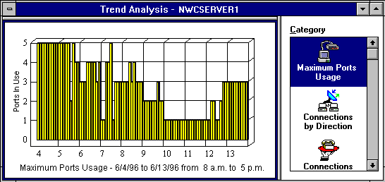 From this example, you can see that the maximum ports usage on the server NWCServer1 is displayed from 8:00 a.m. to 5:00 p.m for 10 days (6/4/96 to 6/13/96). This data indicates that a maximum of five ports were in use simultaneously on 6/4. Only one port was used on 6/10 and 6/11. If the remote access software is licensed for eight ports, this data suggests that port utilization is greater than 50 percent of the available port licenses for more than two days.