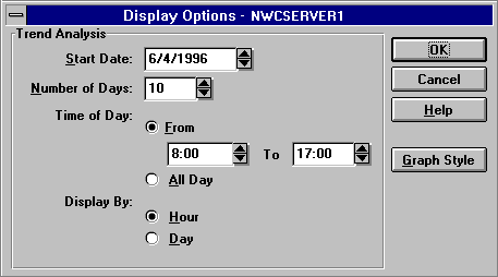 Figure 19 shows a sample Trend Analysis window for ports usage on server NWCServer1. To change the time of day and display interval, ensure the desired graph is selected and choose View > Display Options (F4).
