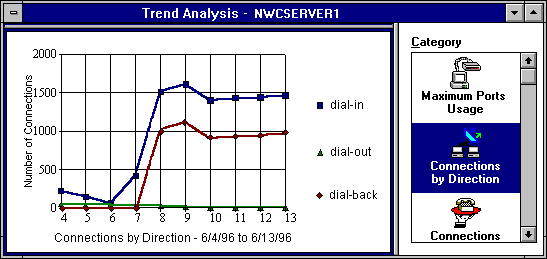 In this example, you can see the number of dial-in, dial-out, and dialback connections made between 6/4/96 and 6/13/96 on server NWCServer1. This data indicates that approximately 1,500 dial-in connections and 1,000 dialback connections were made each day between 6/8 and 6/13, while there were few dial-out connections during the display period.