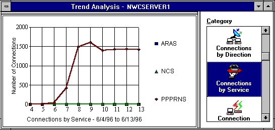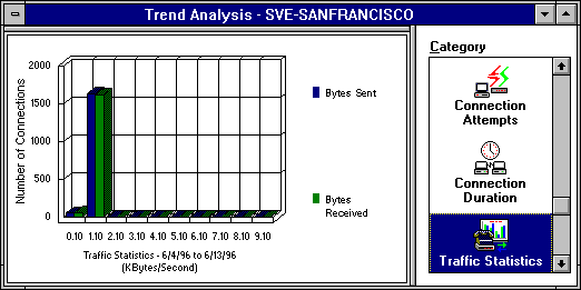 In this example, you can see that all connections between 6/4/96 and 6/13/96 on the server NWCServer1 had less than 2 KBps of traffic.
