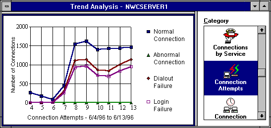 In this example, you can see that there were approximately 1,500 successful connections each day between 6/8/96 and 6/13/96 on the server NWCServer1. Also, notice that during this period a number of dial-out failures and login failures occurred. There were no abnormal connections during the display period.