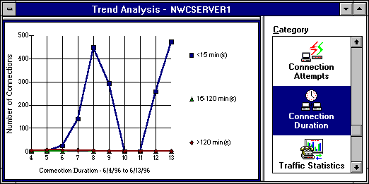 6/4/96 and 6/13/96 on the server NWCServer1. This data indicates that almost all connections were established for less than 15 minutes.