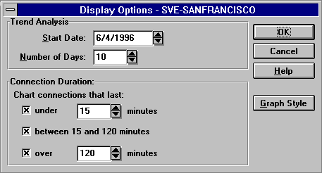 To access the Trend Analysis Display Options dialog box, ensure that a connection duration graph is selected and choose View > Display Options (F4). ConnectView opens the Trend Analysis Display Options dialog box, shown in Figure 25. Specify the desired options and click the OK button.