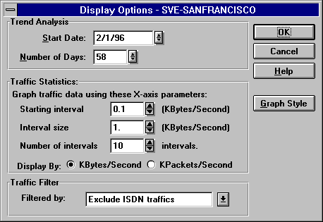To access the Trend Analysis Display Options dialog box, ensure that a traffic statistics graph is selected and choose View > Display Options (F4). ConnectView opens the Trend Analysis Display Option dialog box, shown in Figure 27. Specify the desired options and click the OK button
