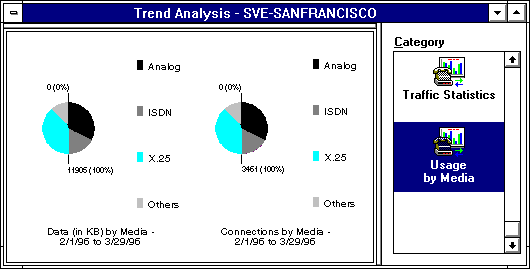 In this example, you can see that most data traffic (40%) on the server San Francisco during the period 2/1/97 to 3/29/97 was analog traffic. Also, most connections (40%) were established for analog connections.