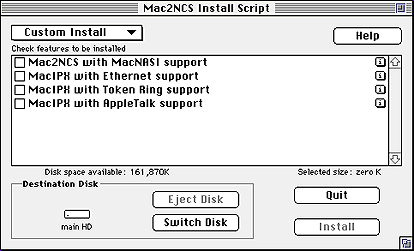 (Conditional) If you selected Custom Install, check Mac2NCS with MacNASI Support, check the other features that you want to install, and then click Install.