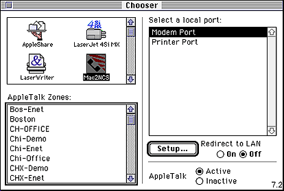If you are using Mac2NCS with an application that enables the Macintosh Communications Tool Box, make sure that the Redirect to LAN option on the Mac2NCS Chooser Window is set to Off.