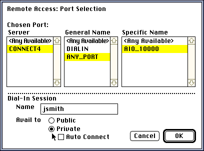 You can select from one or more lists in any order. A General Name of <Any Available> is not recommended. If you intend to dial out but your call is routed to a port in a DIALIN group, then you will be unable to dial out. A selection other than <Any Available> from the Server or Group list might limit the choice of port. If the specific port you have selected is not available, you might be unable to use Mac2NCS temporarily.