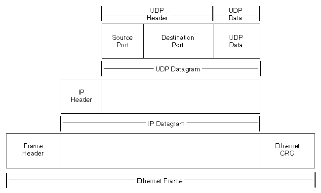 The UDP datagram is encapsulated in an IP datagram that, in turn, is encapsulated in physical frames. Figure 3 shows a UDP datagram encapsulated in an IP datagram, which, in turn, is encapsulated in an Ethernet frame. Figure 3 also illustrates how the concept of layering, discussed at the beginning of this section, affects the construction of packets sent across the network.