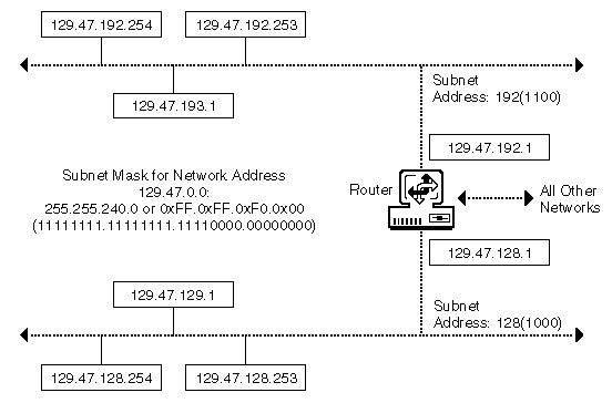 Figure 11 shows a single IP network divided into two subnets. The router shown has physical attachments and IP addresses on both subnets (129.47.128.1 and 129.47.192.1). It might also have physical devices and IP addresses (nn.nn.nn.nn) connecting it to other networks.