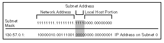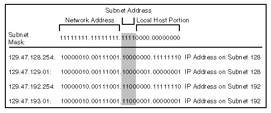 A subnet mask indicates how the host portion of the IP address is divided into a subnet address and a local host portion. The network mask is a 32-bit number with all ones for all network and subnet address portions, and all zeros for the host field. With a Class B network portion of 129.47 and a 4-bit subnet address, for instance, the subnet mask consists of 20 ones and 12 zeros. In essence, a subnet mask locally extends the network address portion of an IP address and reduces the host portion.