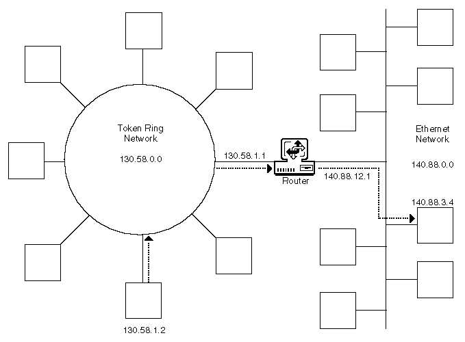 When a datagram is sent to a node on another network, the network portions of the source and the destination IP addresses are different. When the packet is received by a router that connects the source to the destination network, the router forwards the packet on the correct interface to reach the destination, as shown in Figure 14. Two networks are connected if at least one router is attached to both networks.