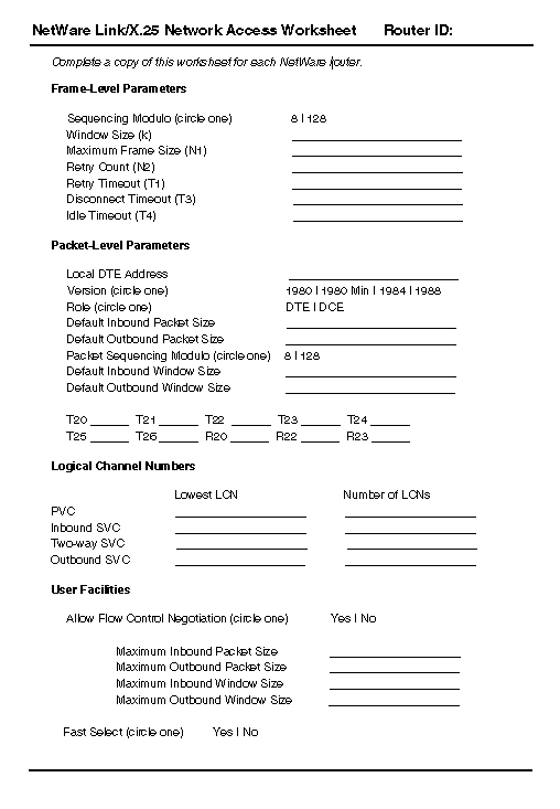 - Using the information from Step 1, fill in the NetWare Link/X.25 Network Access Worksheet.