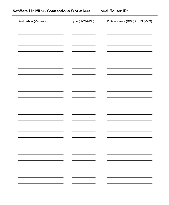 - Using the information from Step 3, fill in the NetWare Link/X.25 Connections Worksheet.