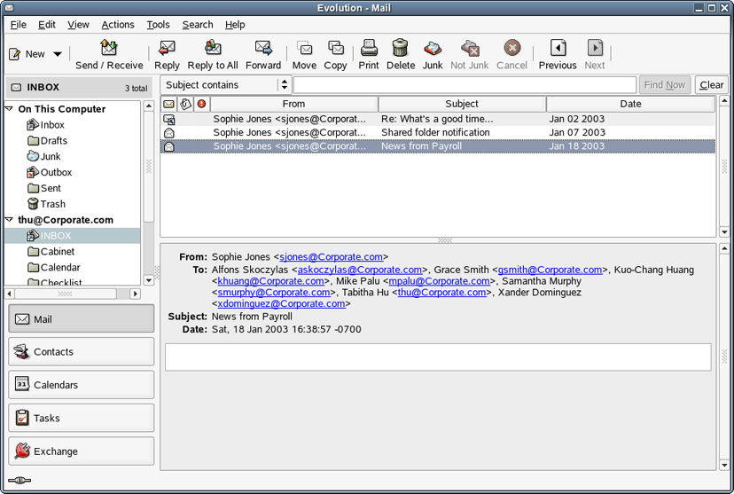 Evolution can help you work in a group by handling e-mail, address, and other contact information, as well as one or more calendars. It can do all this on one or several computers, connected directly or over a network, for one person or for large groups.
