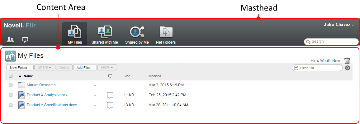 Search Field: A global search that searches all content within the Filr site, including file metadata and content within files.