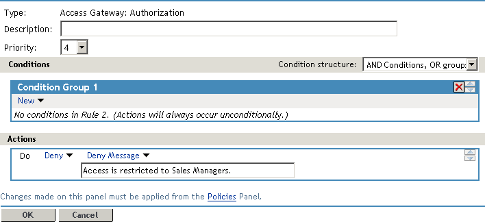 The second condition group matches the users who are managers but don’t belong to the sales department. Because they match both conditions, the Deny action is applied. For these two condition groups to work with this logic, the is set to .